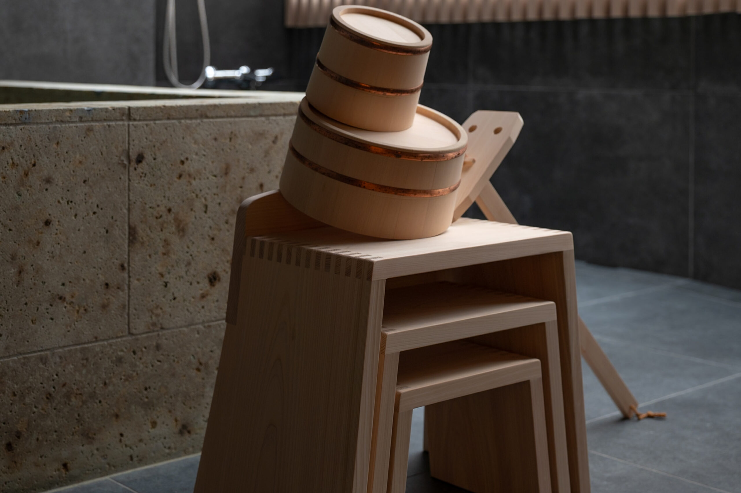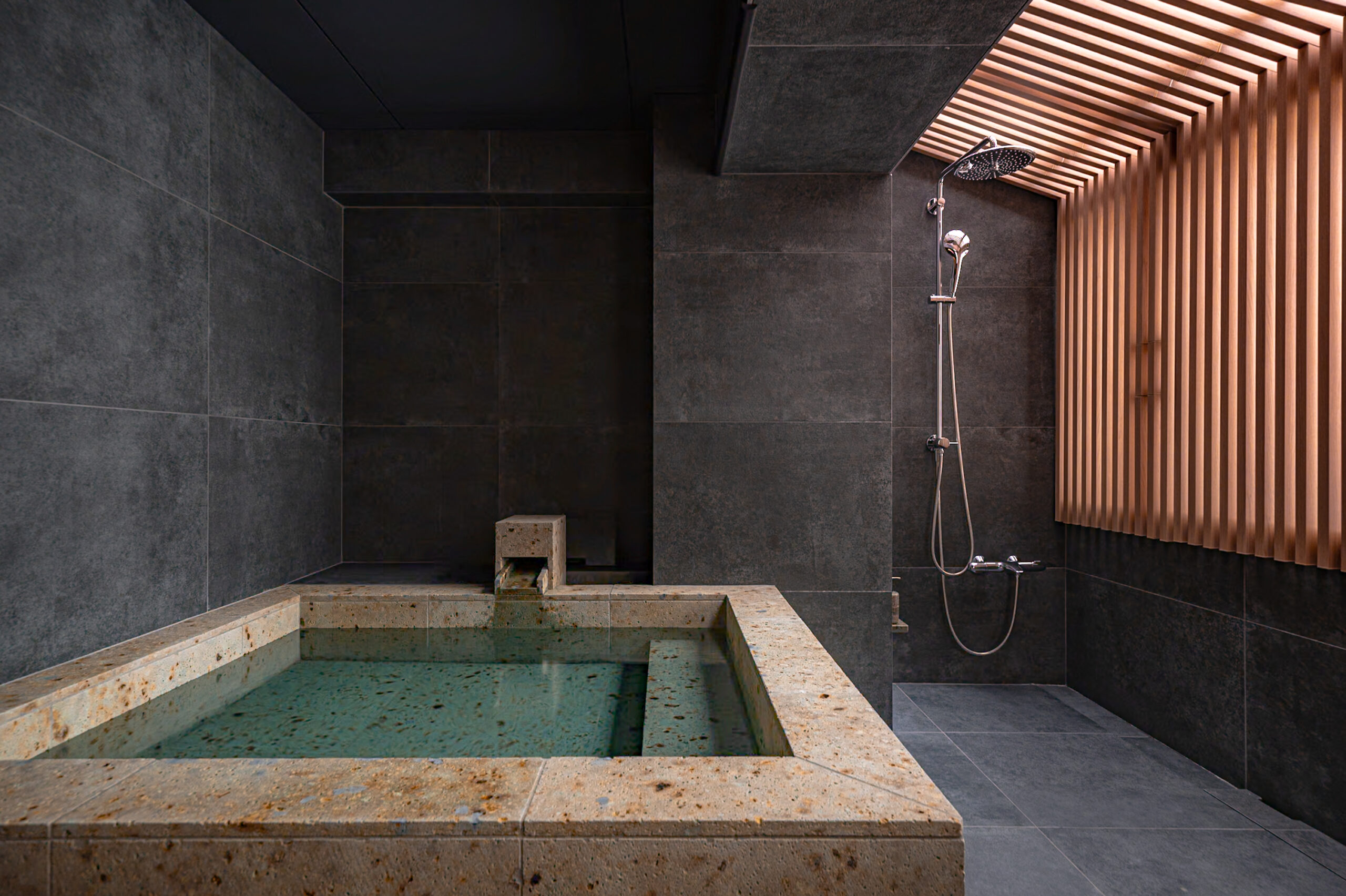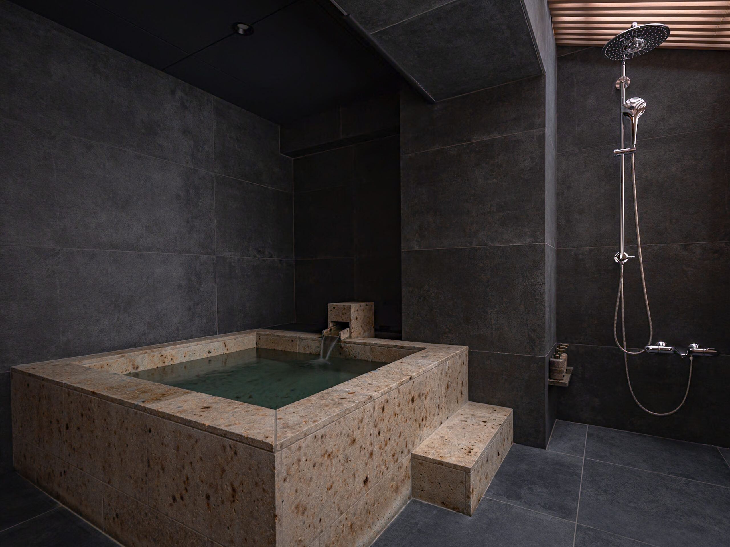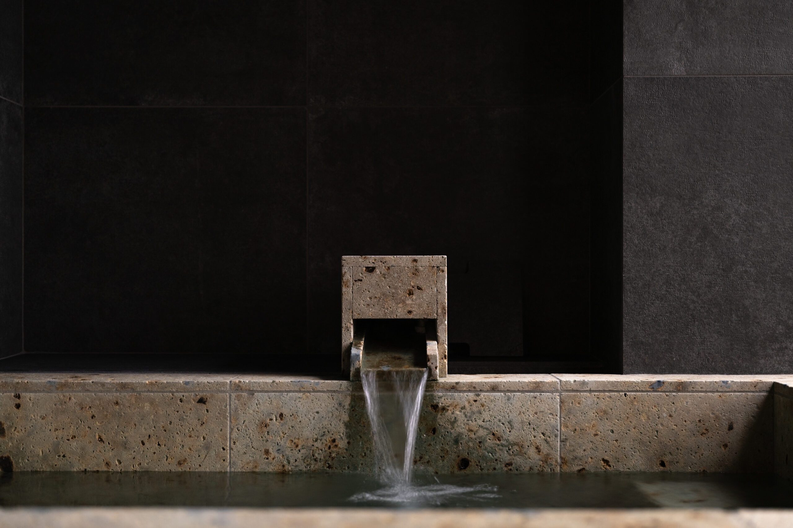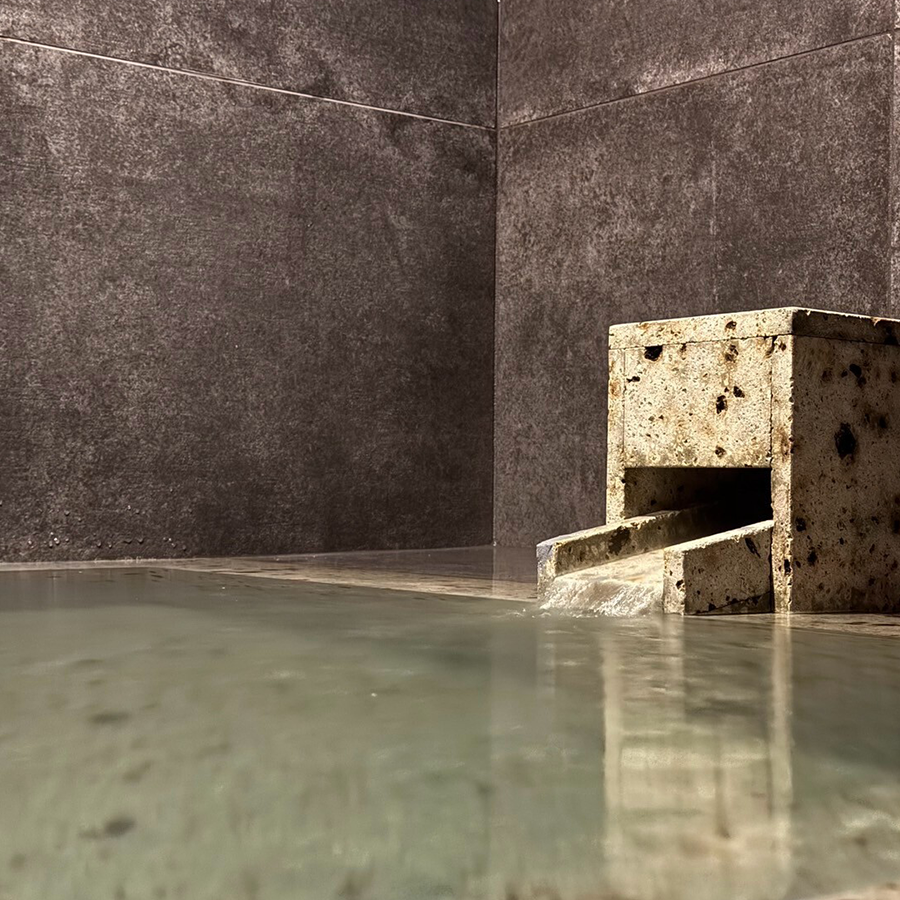 At the heart of SUIROW lies a custom-crafted stone bath, carved from fine quarried marble.